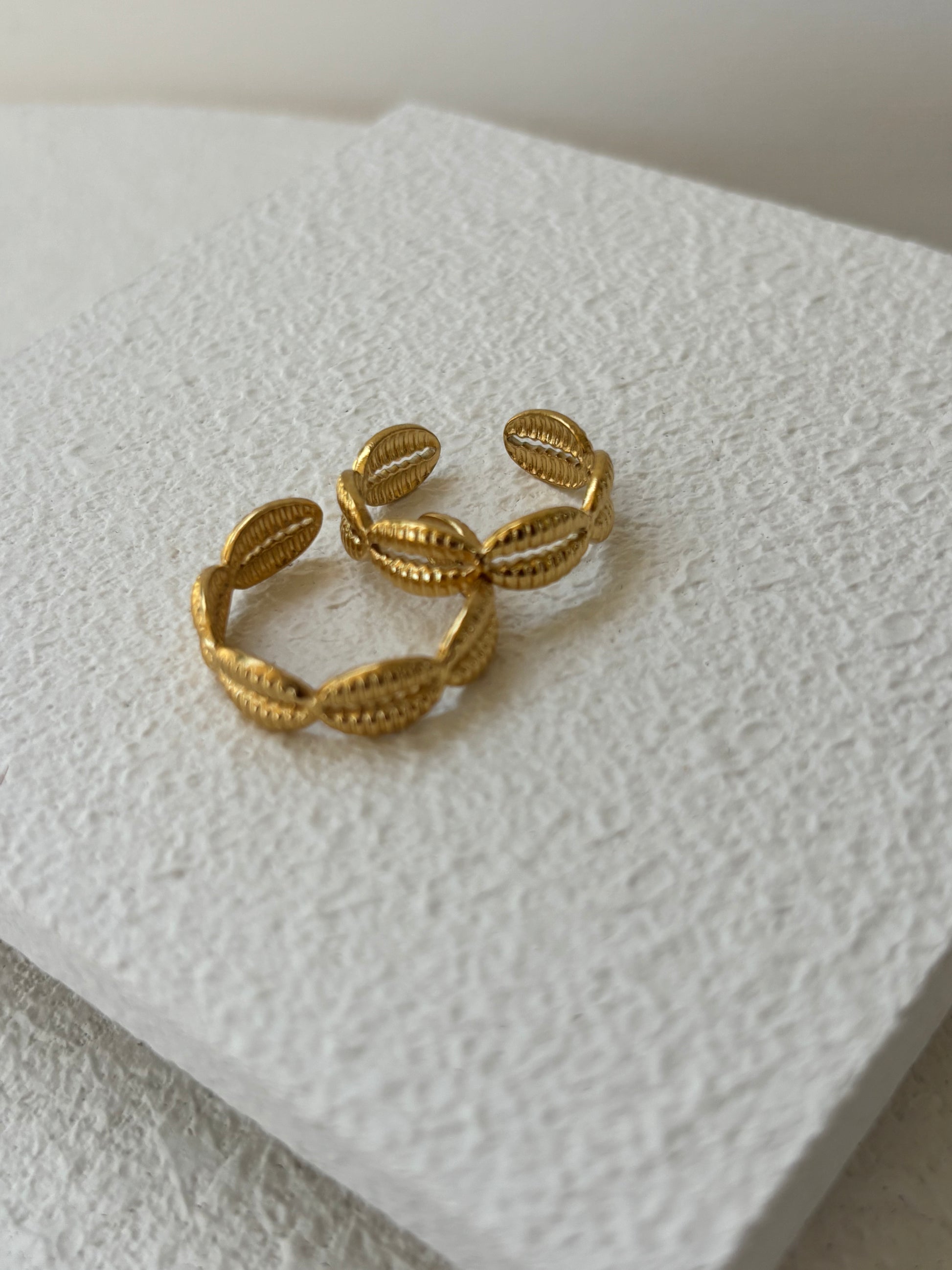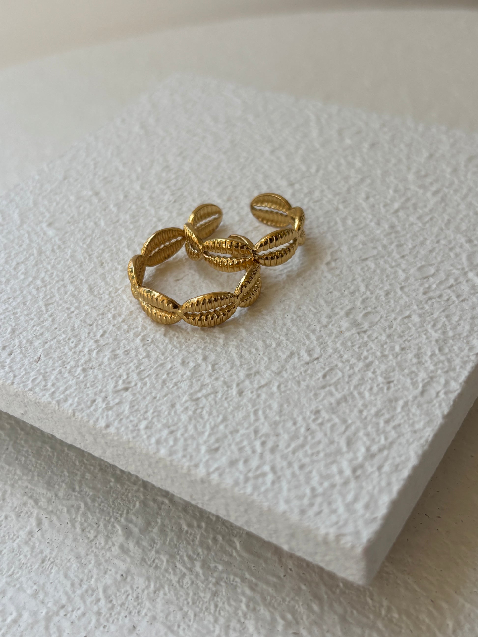 La sortija Carolina destaca por su diseƱo de conchitas finamente detalladas, evocando frescura, libertad y elegancia natural.