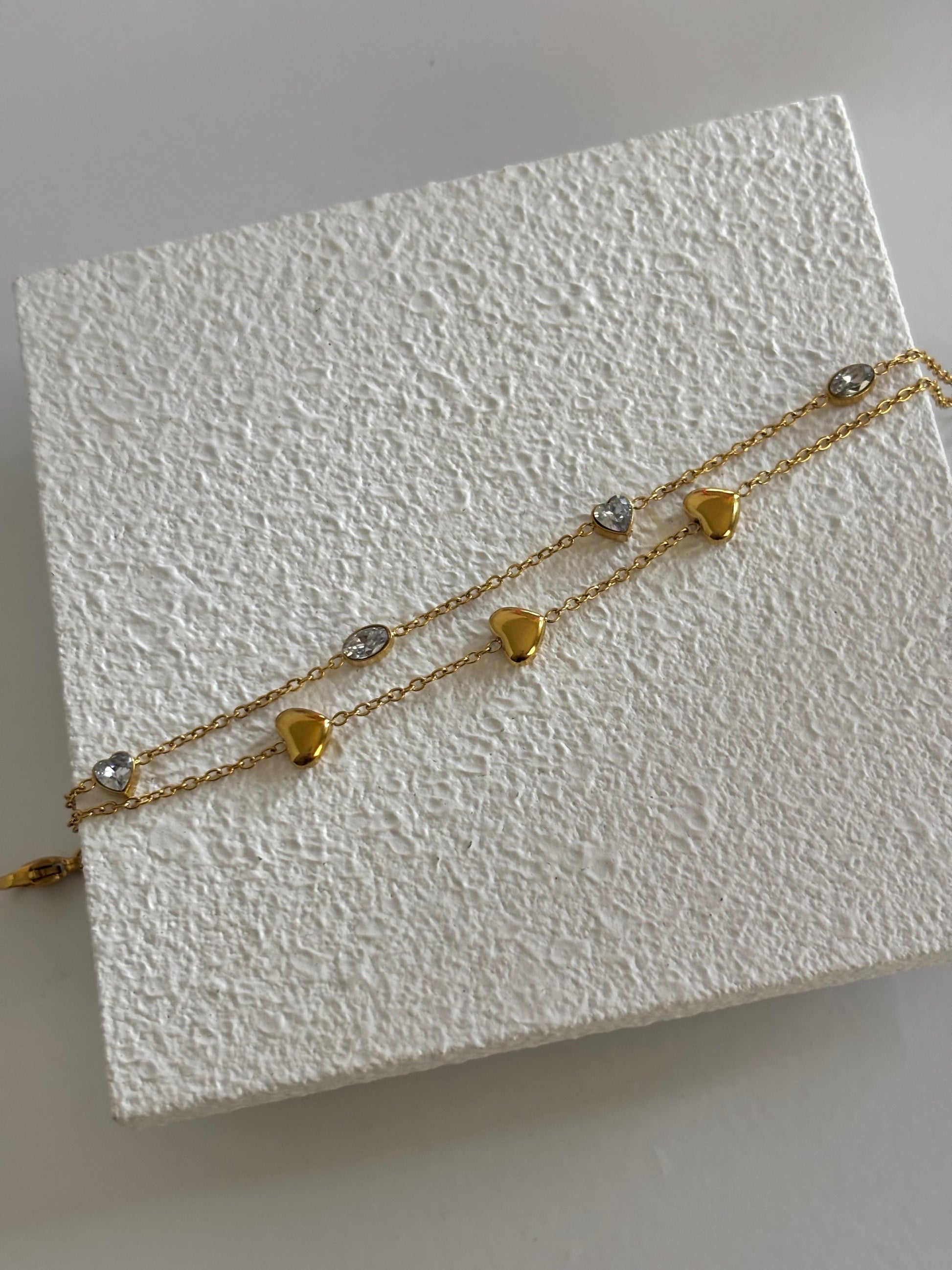 Pulsera doble en acero inoxidable con baño de oro 18K, adornada con corazones dorados y cristales brillantes.