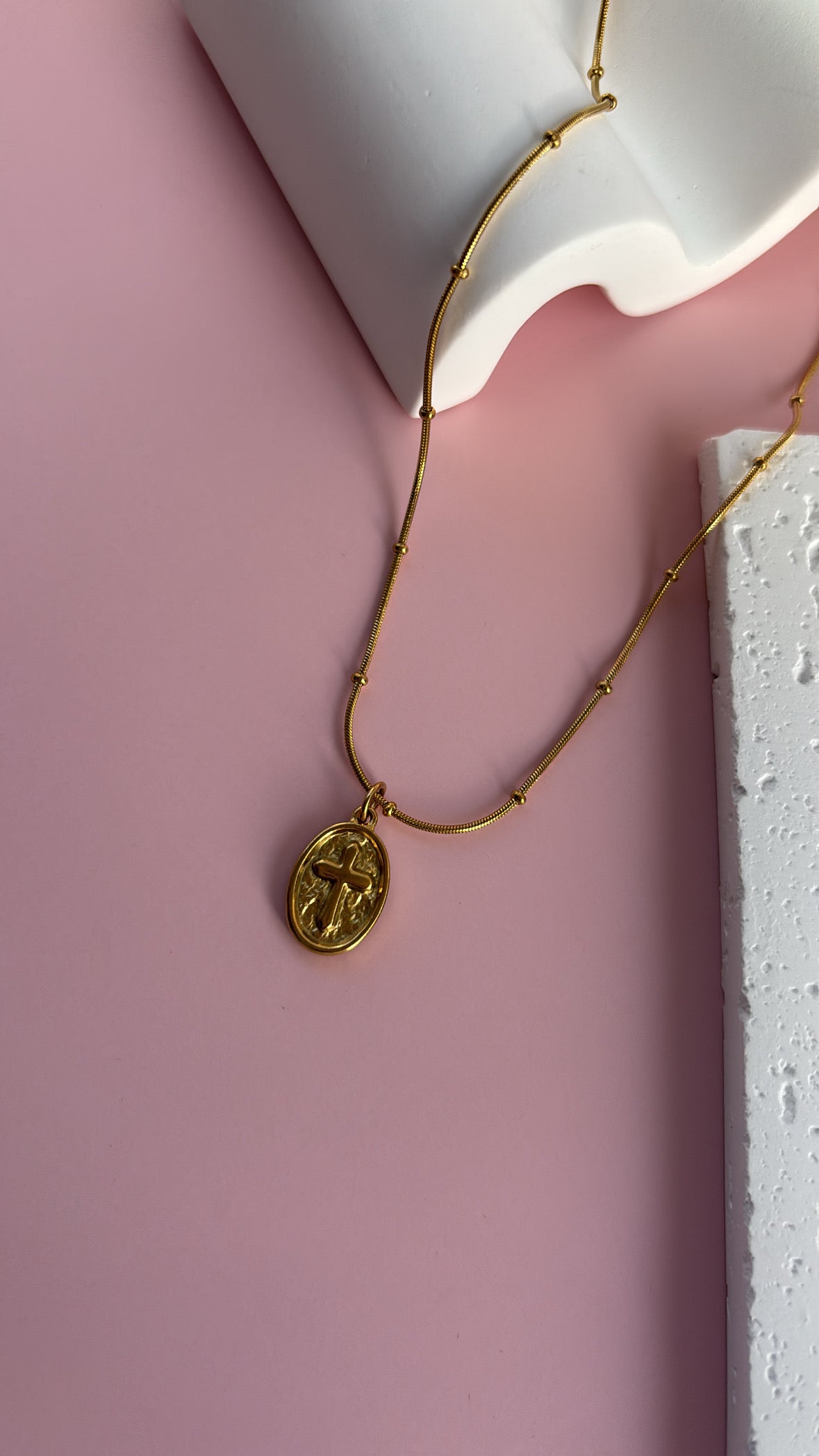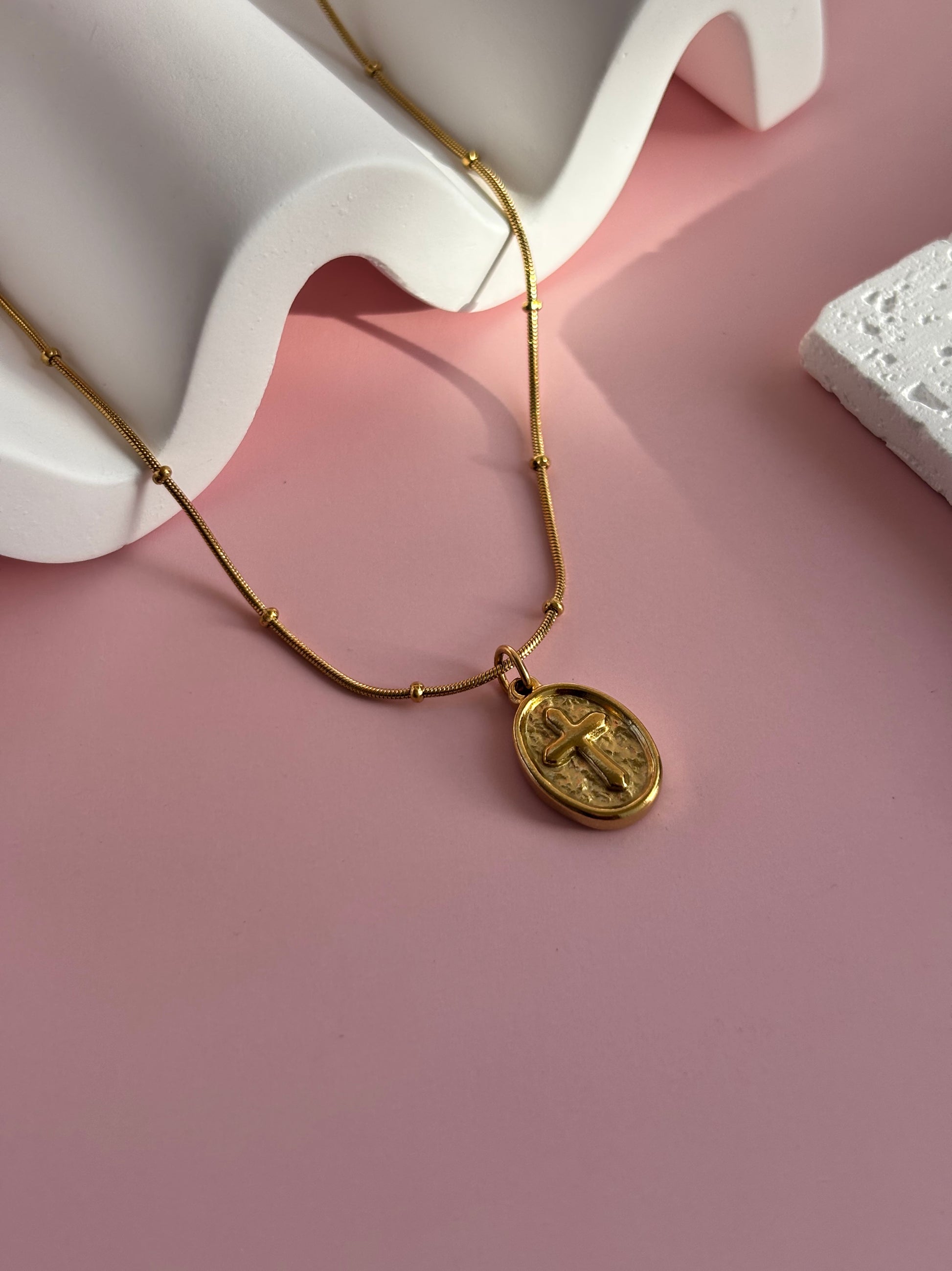 Fabricado en acero inoxidable 316 bañado en oro 18K, con dije ovalado en relieve de cruz, combina elegancia con un símbolo eterno de fe.