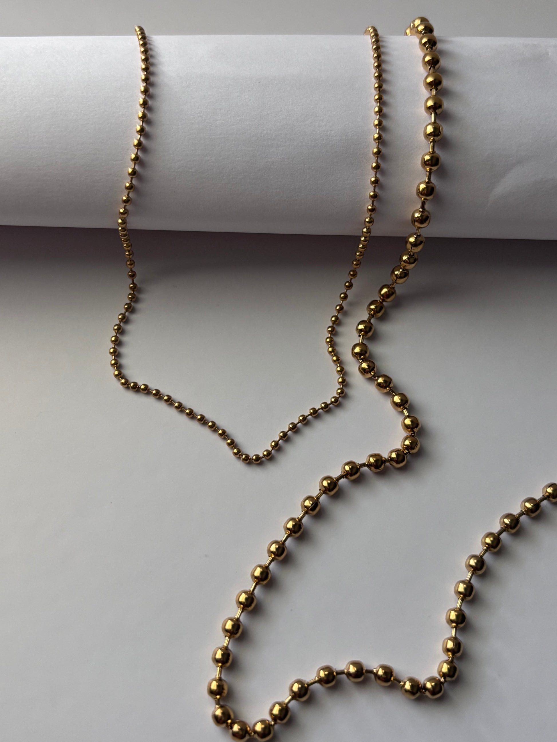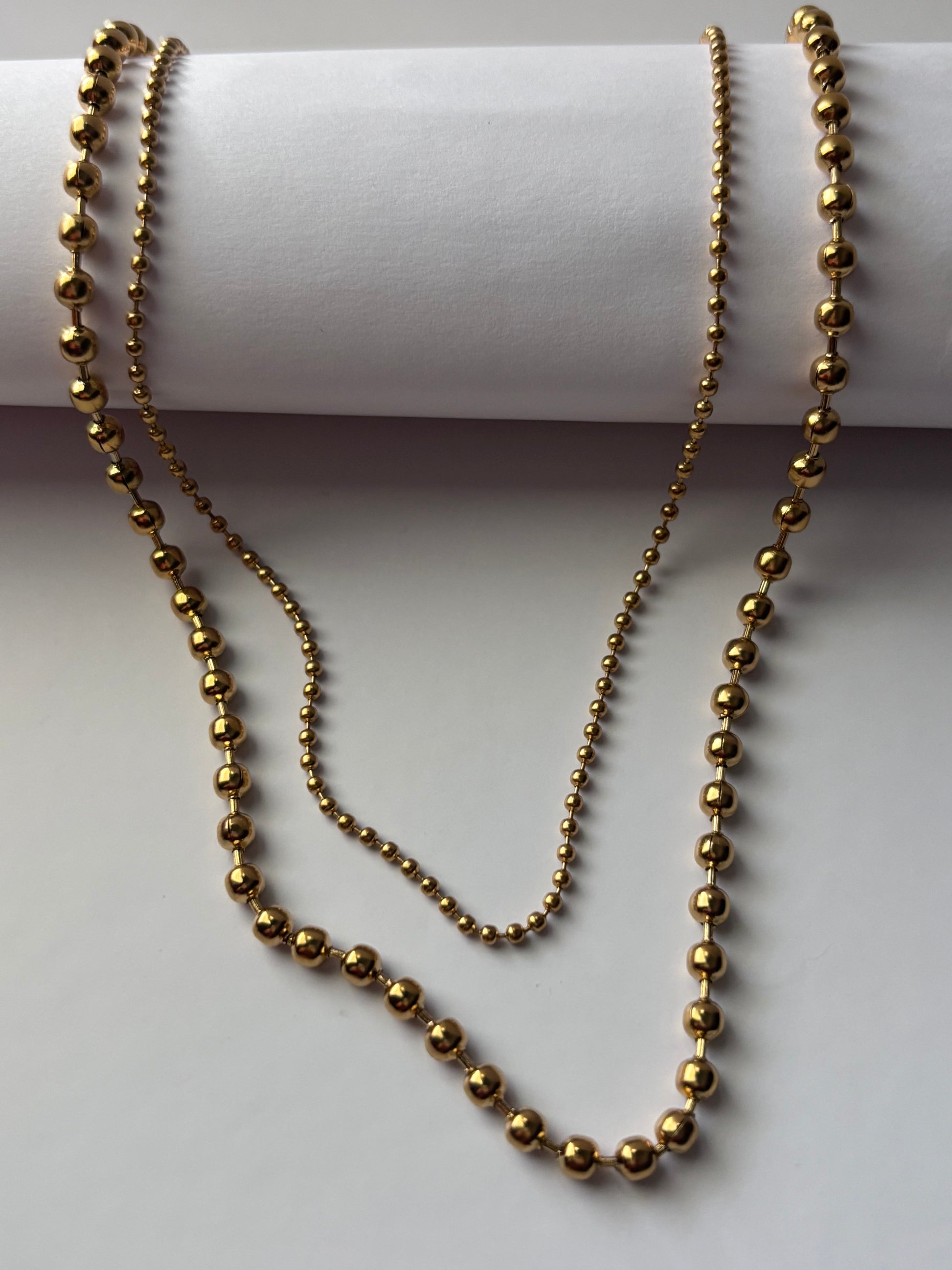 Incluye dos cadenas: una de esferas finas y una de esferas medianas, perfectas para usar juntas o por separado.