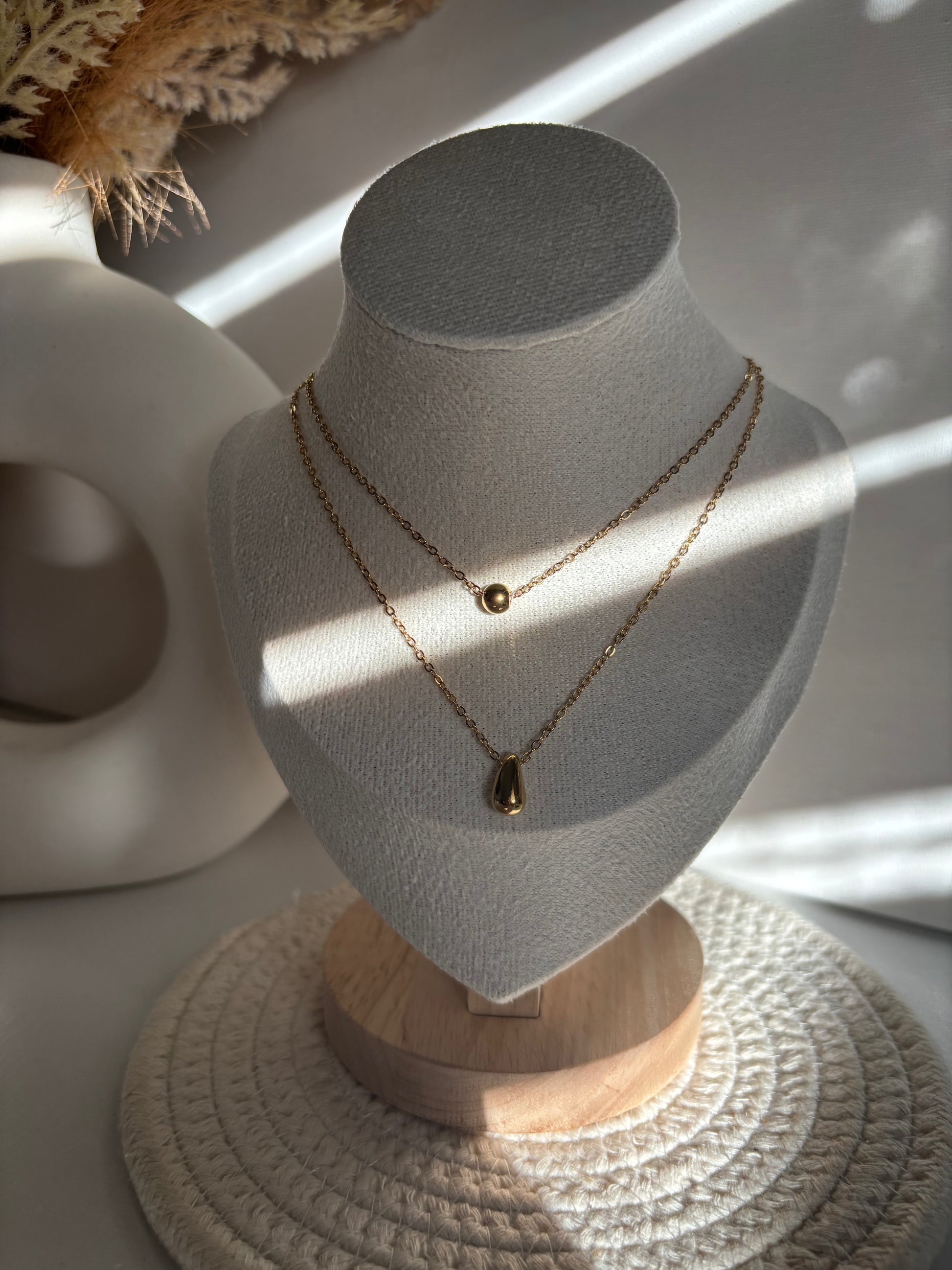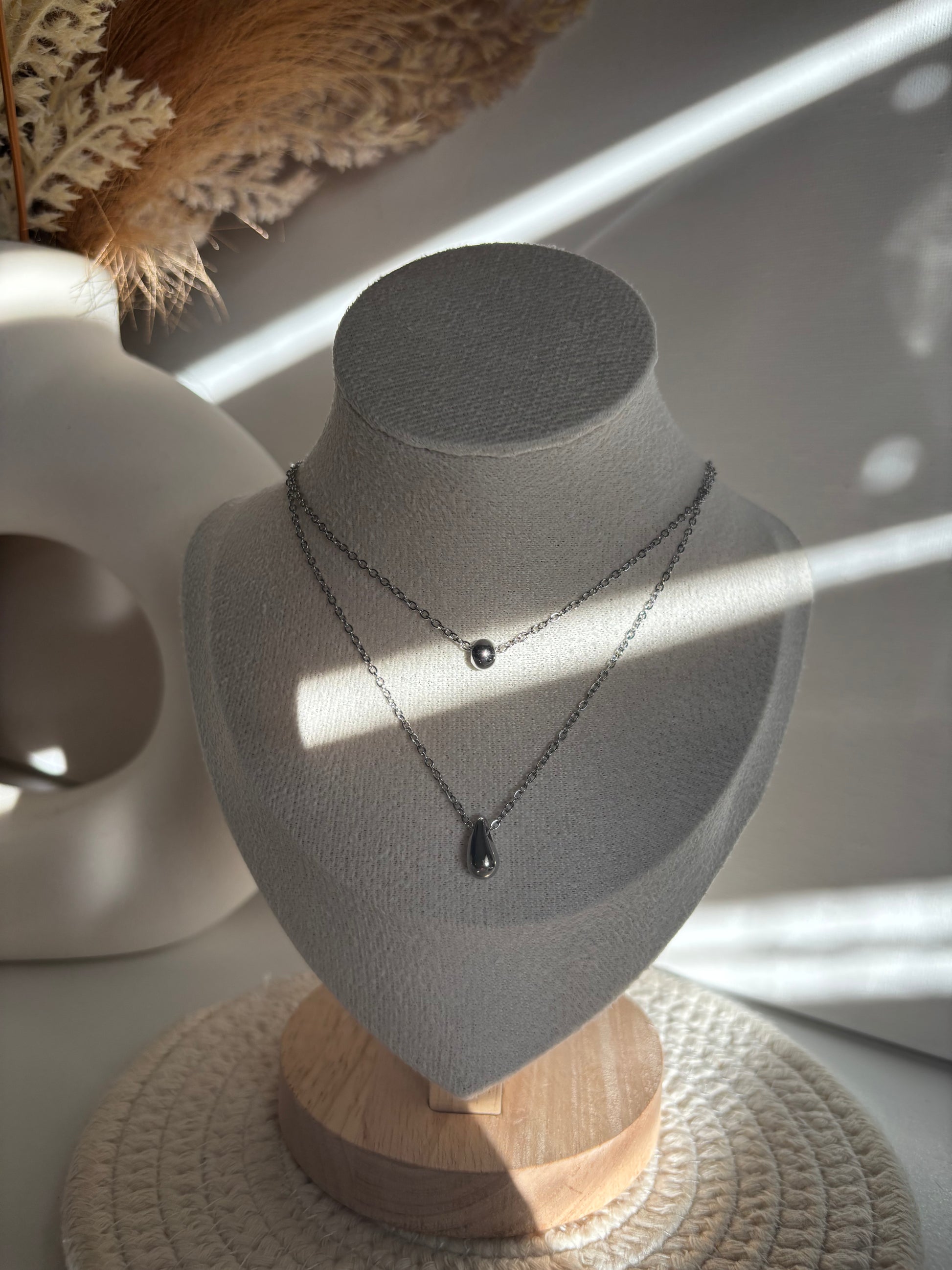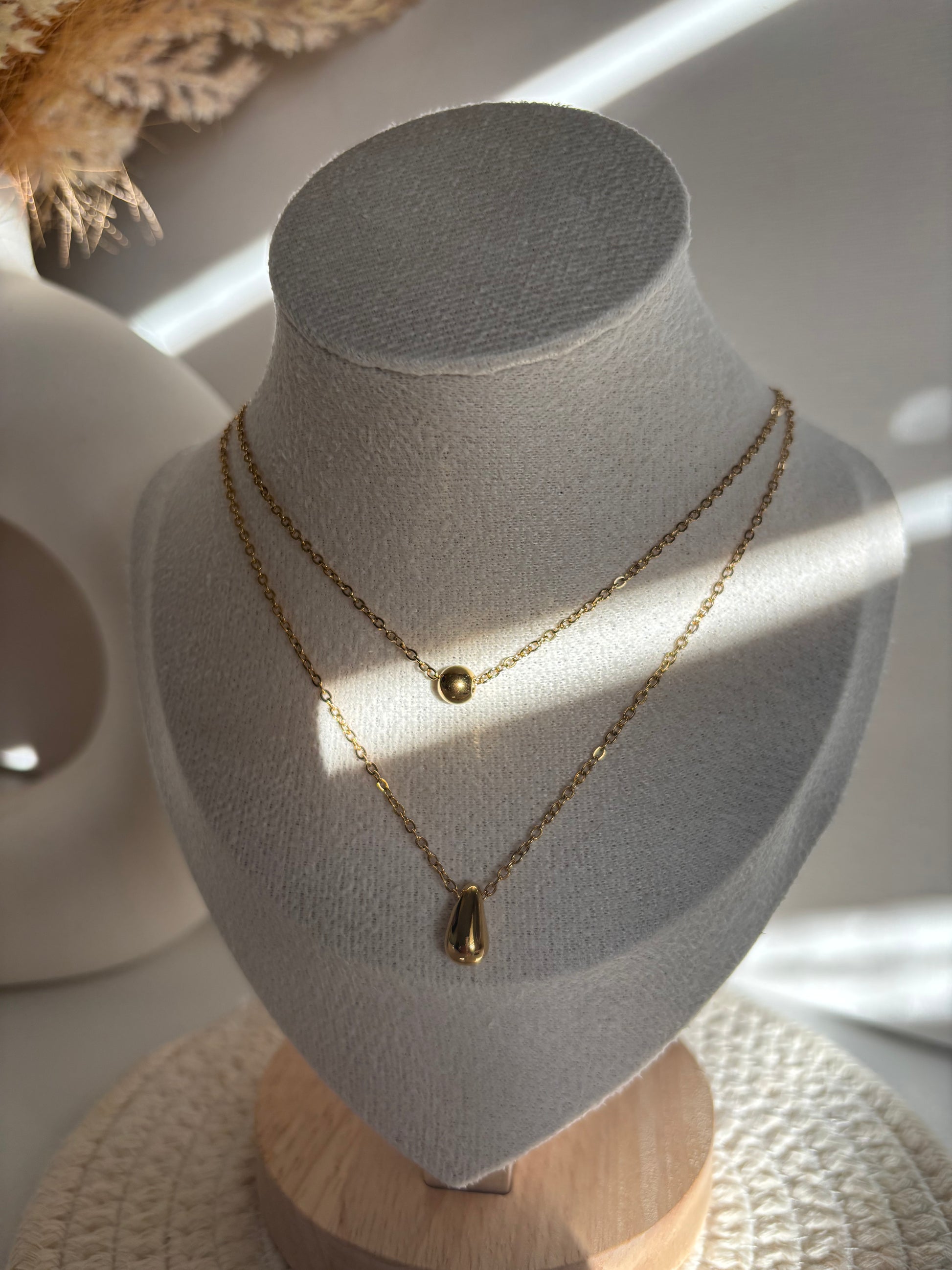 Elegancia en cada gota. Collar delicado con colgantes tipo lágrima, ideal para un look sutil y sofisticado. Acero inoxidable 316L, resistente y brillante.
