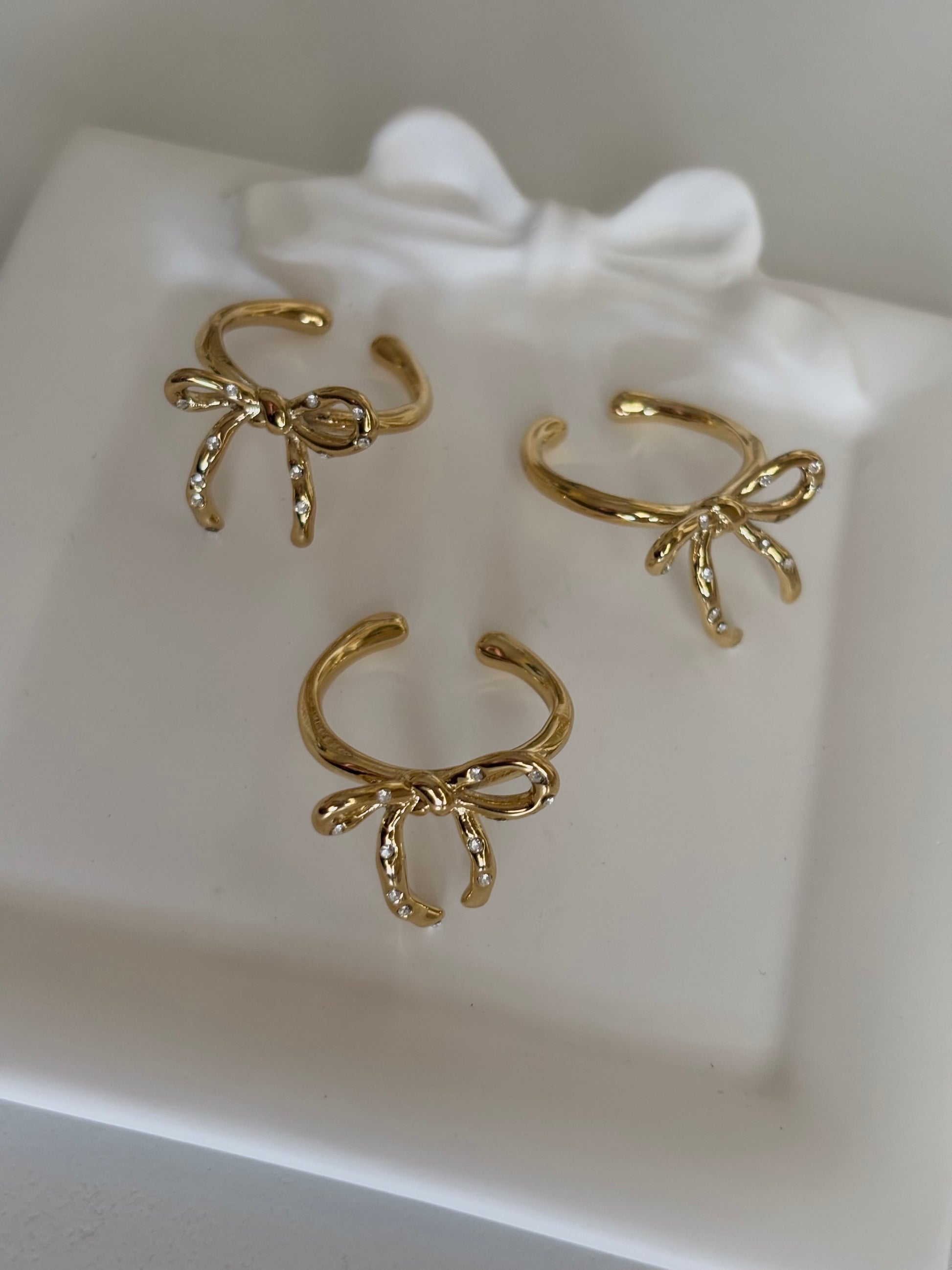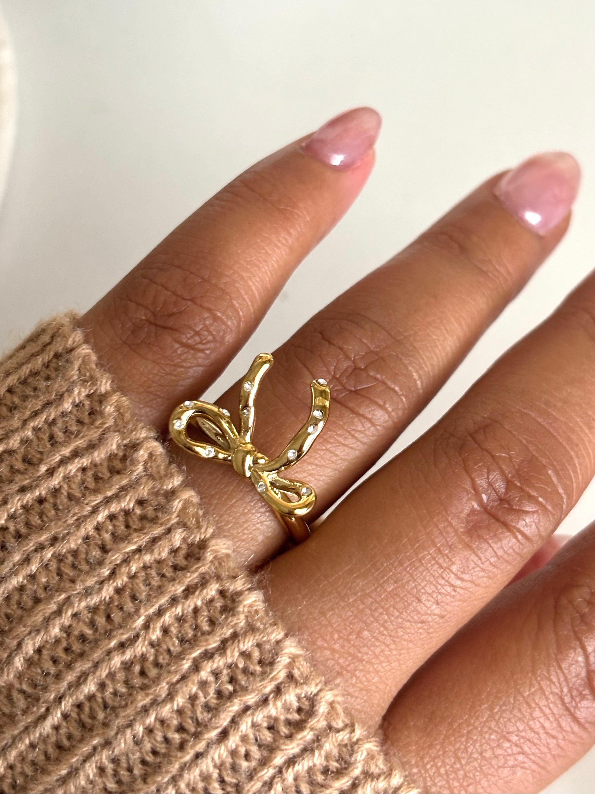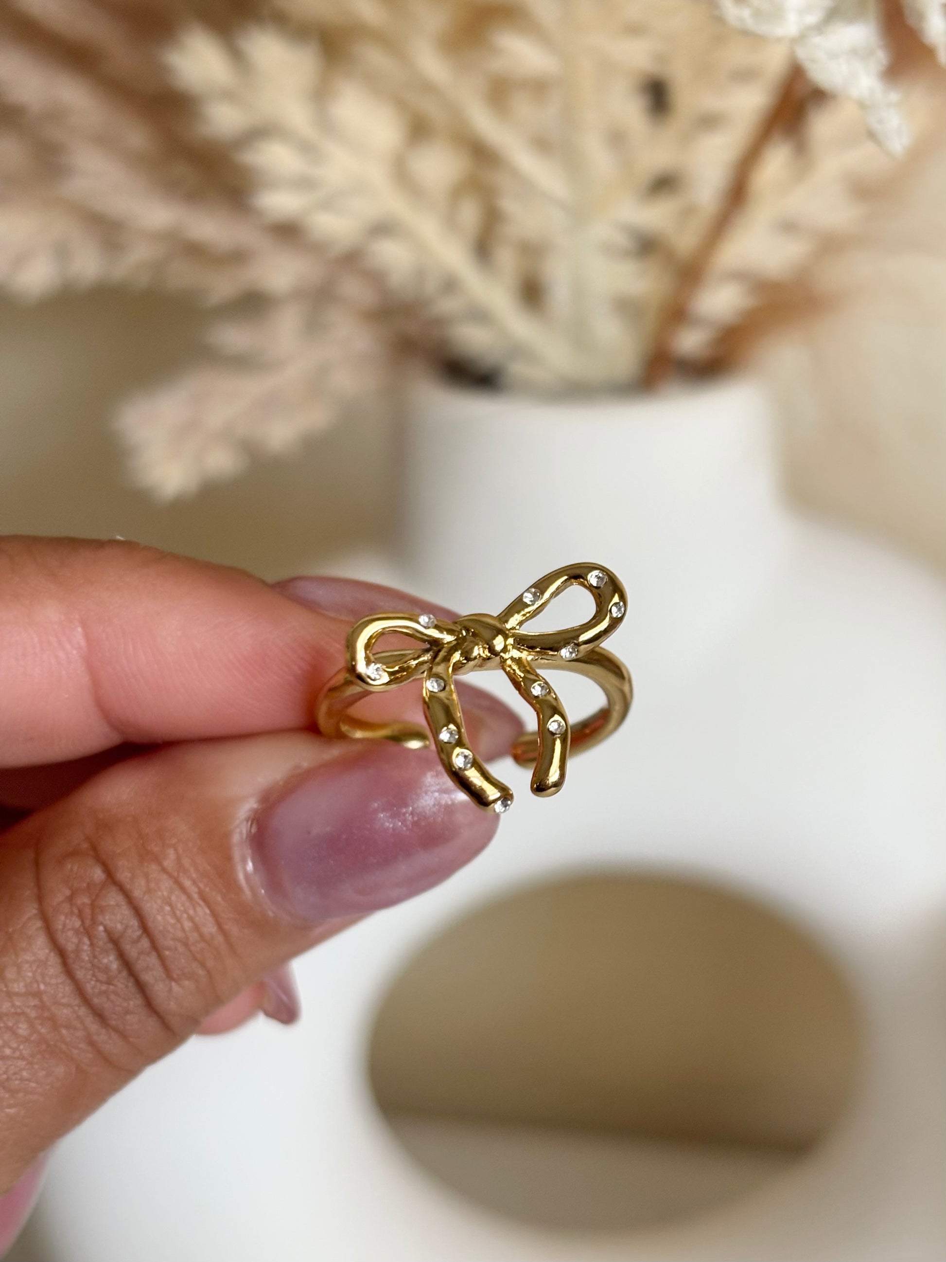 Sortija en forma de lazo, hecha en acero inoxidable con delicados cristales incrustados. Ajustable y resistente al agua, es el toque dulce y elegante que transforma cualquier look.