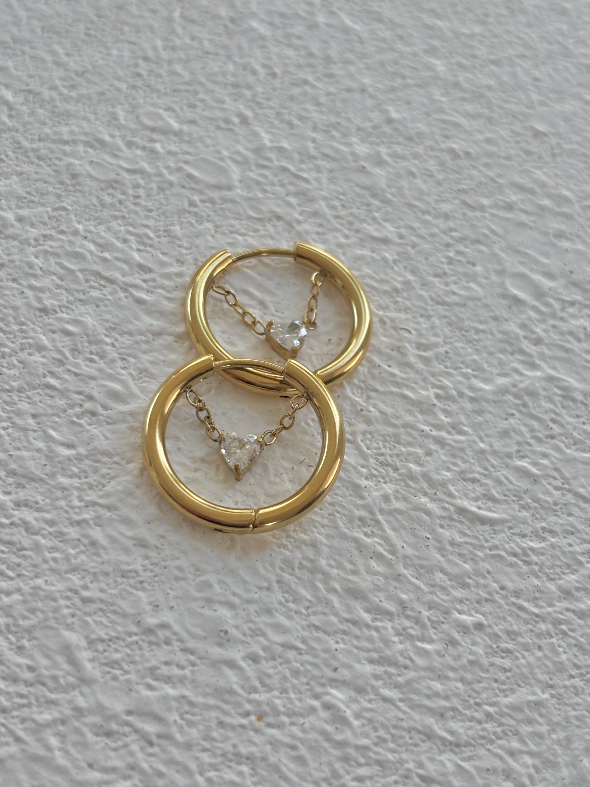 Pantallas tipo aro con un delicado corazón colgante. Hechas de acero inoxidable 304 y bañadas en oro 18K. Resistentes, hipoalergénicas y perfectas para usar a diario con un toque romántico y moderno.