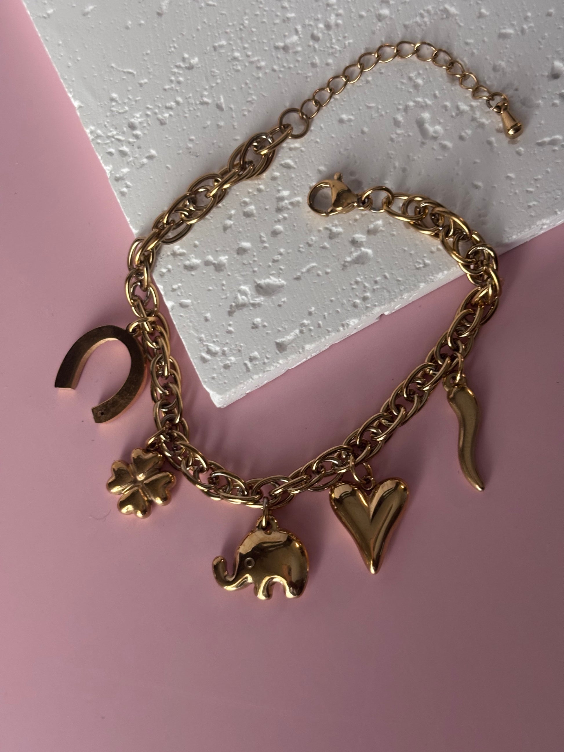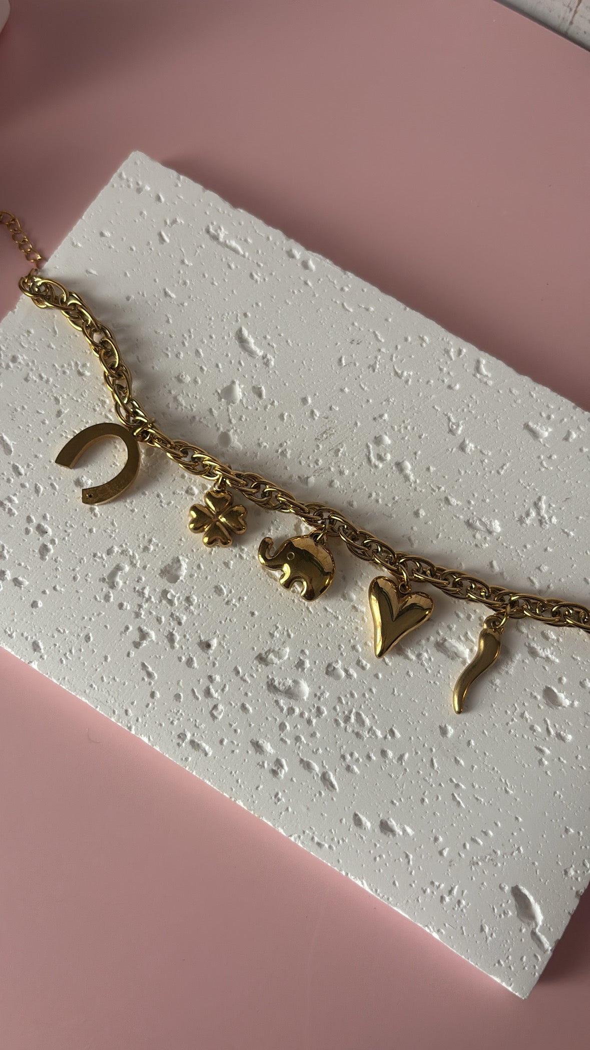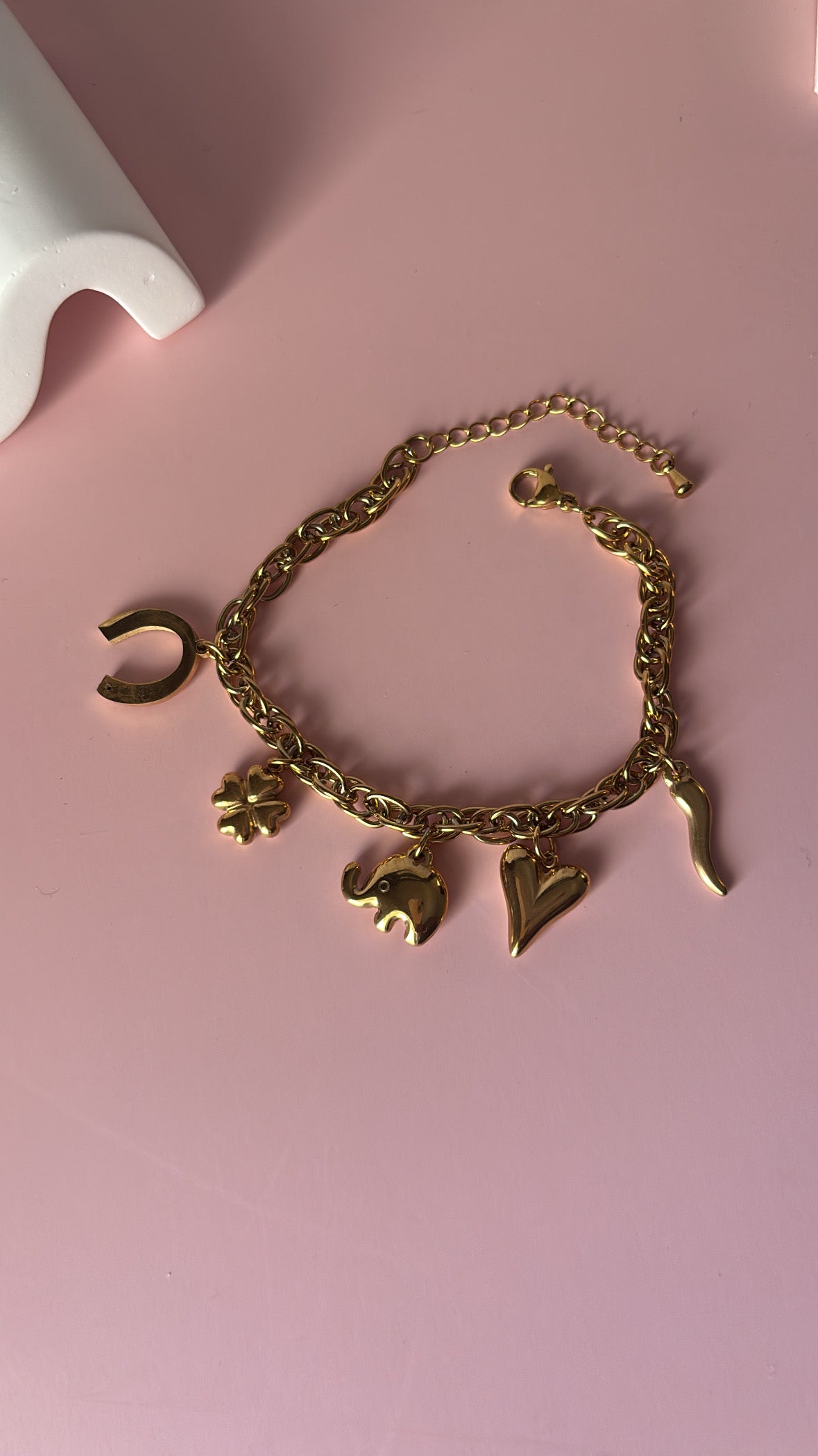 Un brazalete lleno de significado y estilo. Su diseño en acero inoxidable dorado combina cinco dijes que simbolizan fortuna, protección y amor: herradura, trébol, elefante, corazón y cuerno italiano. Waterproof e hipoalergénico, ideal para usar todos los días sin perder brillo. Una pieza chic que atrae buena energía y completa tu look con un toque elegante.