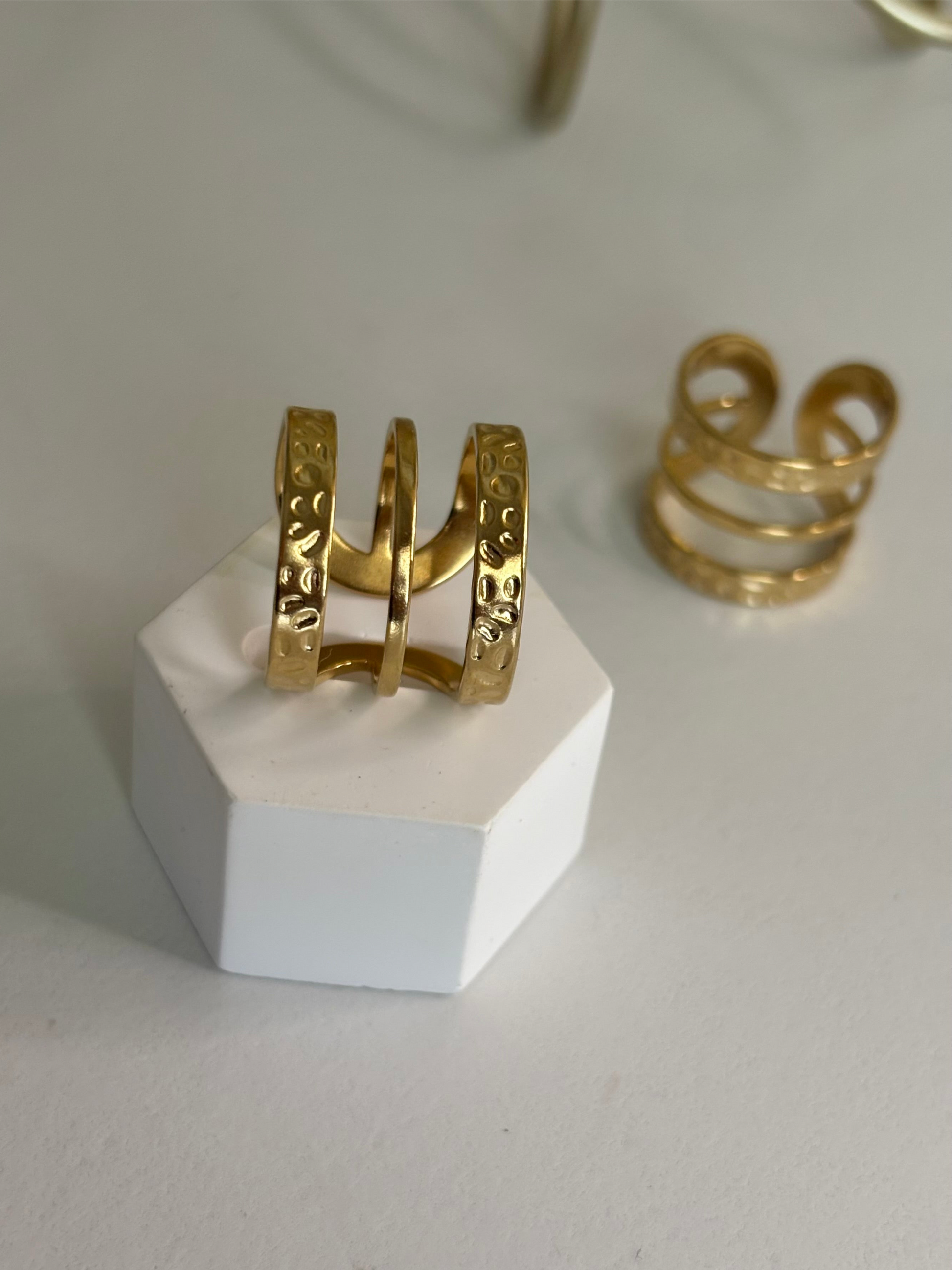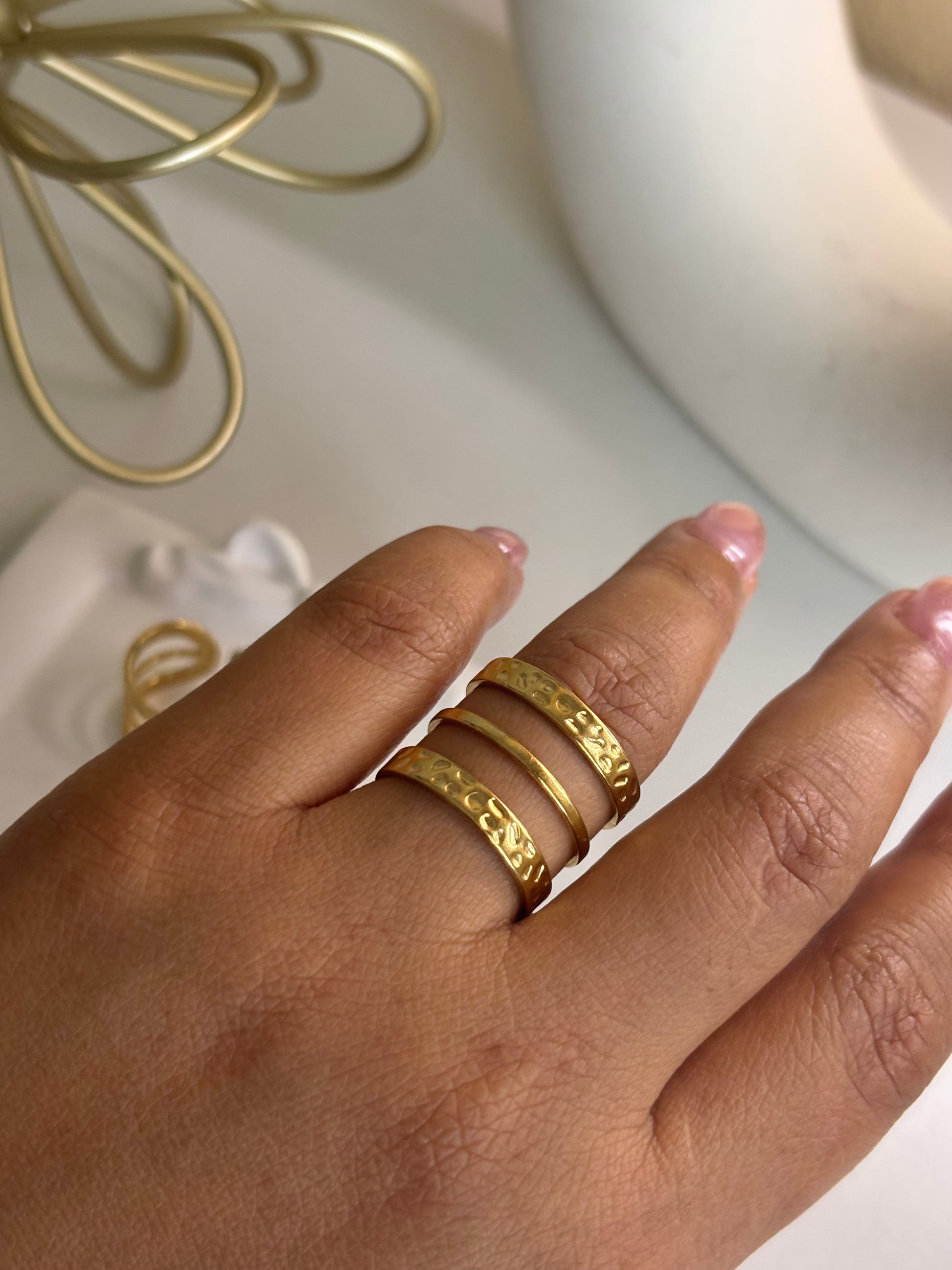 Sortija de acero inoxidable con diseño de tres líneas, dos de ellas grabadas con delicados detalles. Ajustable y resistente al agua, ideal para un look chic con un toque único.