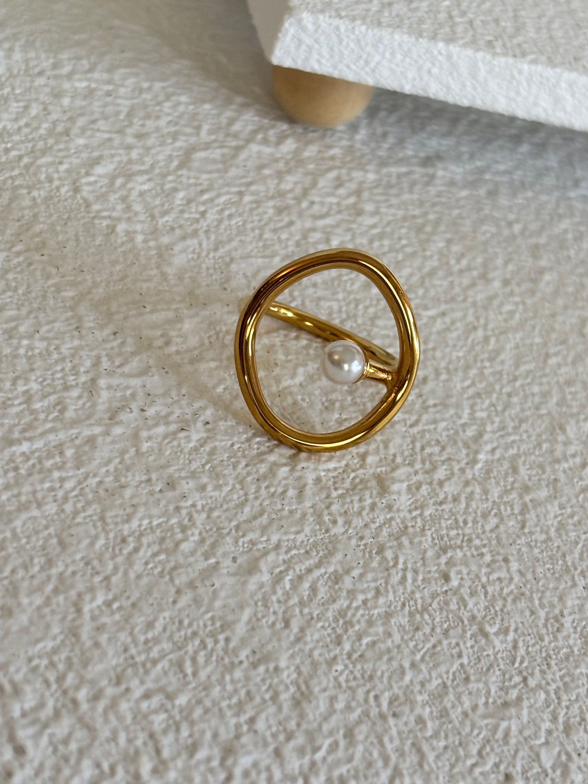 Sortija elaborada en acero inoxidable chapado en oro 18K, con un diseño circular irregular que realza la delicadeza de una perla blanca en el centro.