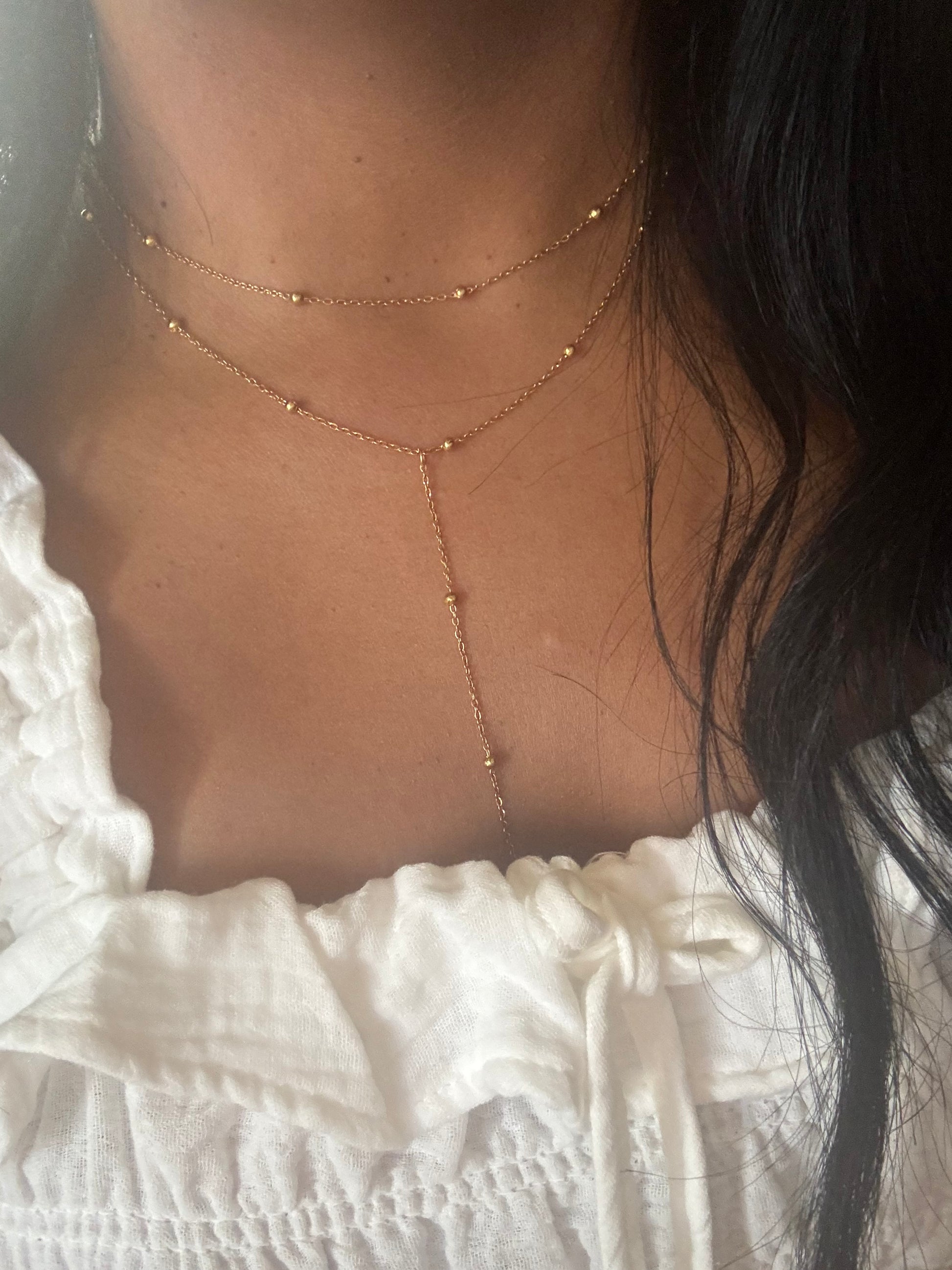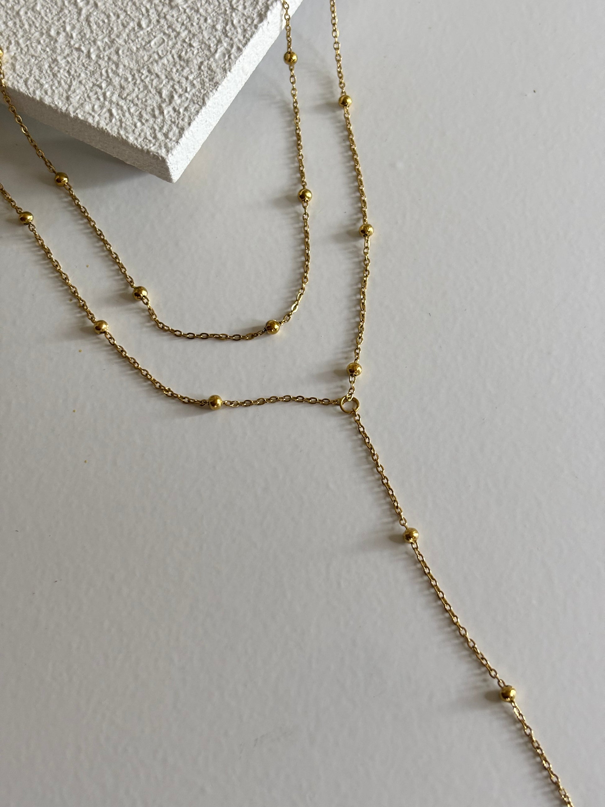 Eleva tu look con este collar doble en acero inoxidable 18K, adornado con delicadas esferas doradas que aportan un brillo elegante y atemporal.