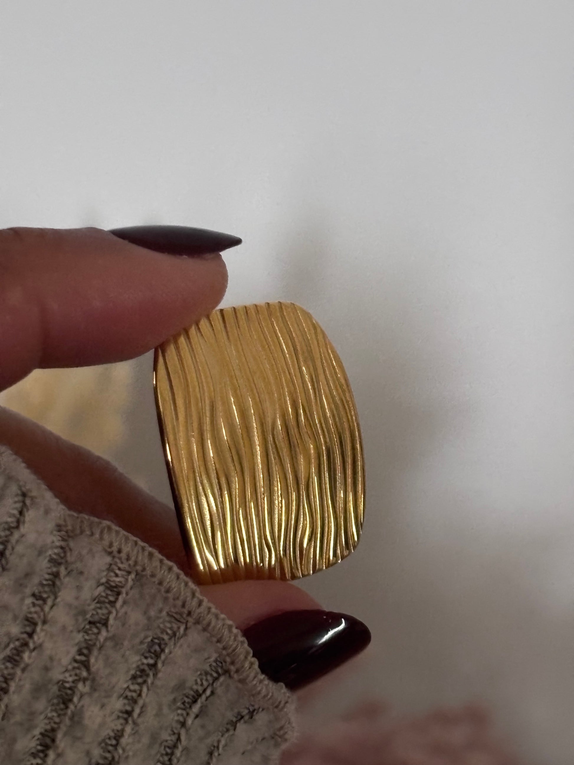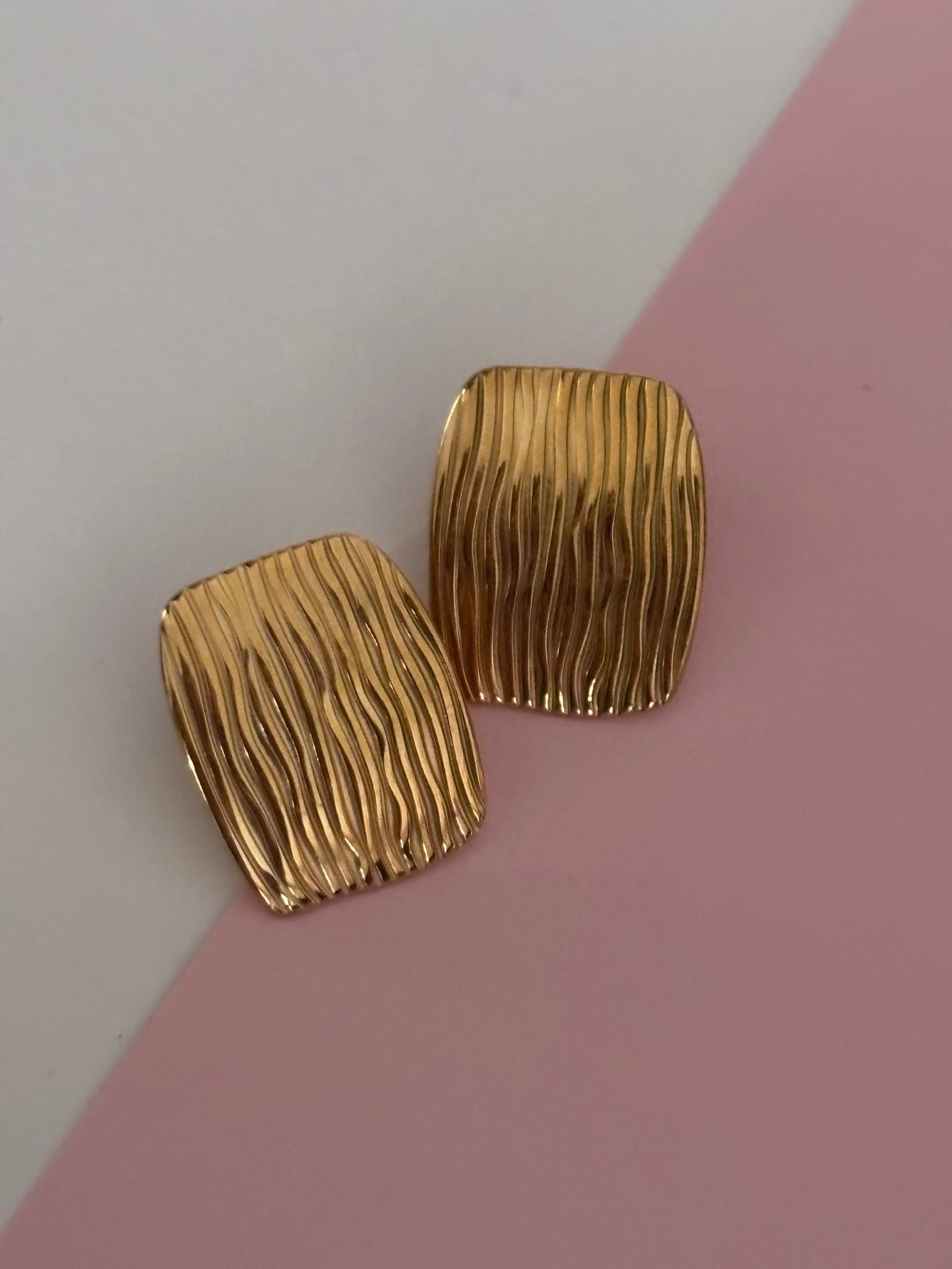 Aretes de diseño rectangular con textura ondulada en acero inoxidable 316 con baño de oro 18K. Una pieza versátil y sofisticada que aporta un toque moderno a cualquier outfit. Resistentes al agua e hipoalergénicos, ideales para usar todos los días.