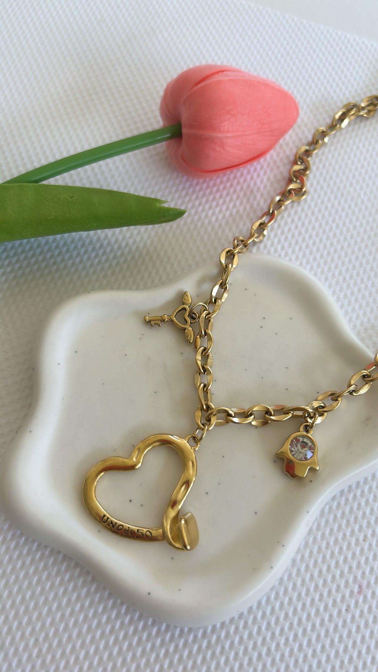 El collar Trinity, elaborado en acero inoxidable 304, presenta un diseño único con un corazón, una manita de sabache, y una llavecita con alitas. Es una pieza que combina estilo, protección y un toque de misterio, perfecta para cualquier ocasión.