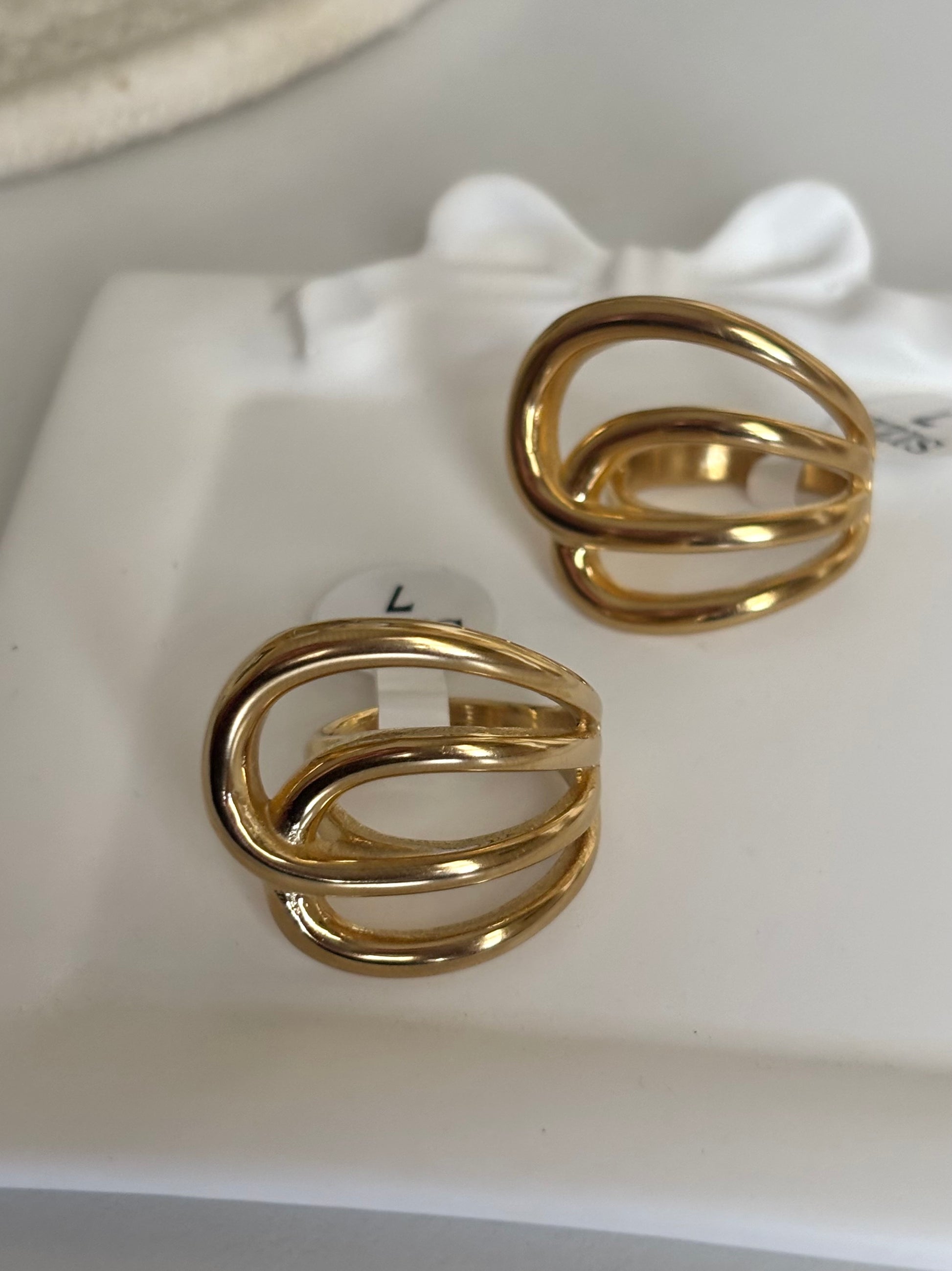 Una pieza statement que une elegancia y carácter. Su diseño curvo y envolvente en acero inoxidable 304 bañado en oro le da un toque moderno y sofisticado. Ideal para destacar en cualquier ocasión sin preocuparte por el desgaste: es resistente al agua, hipoalergénica y duradera.